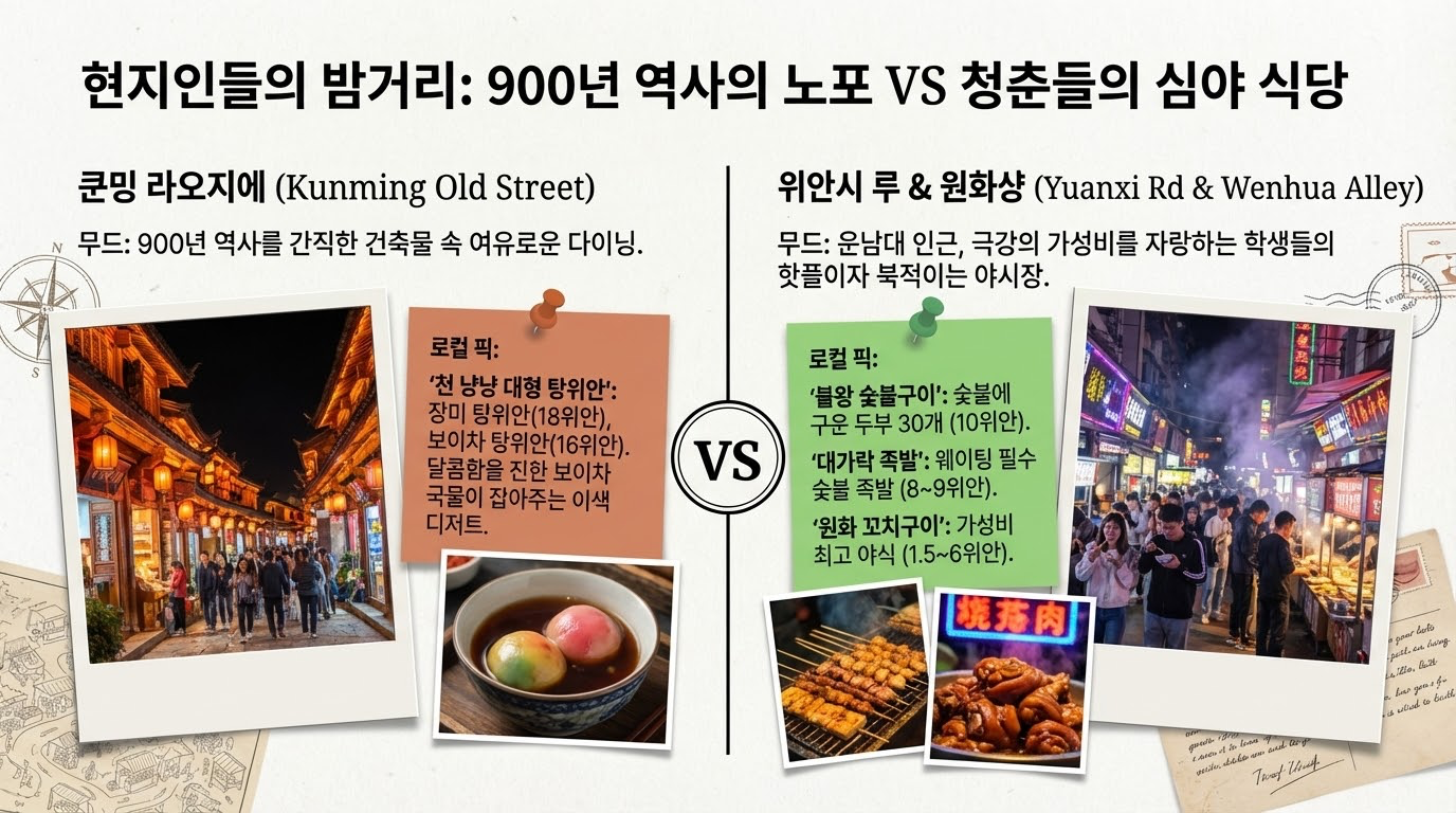 - 현대적 상생 모델: 100년 역사의 전통 약방 '복림당'과 고가구점들 사이로 현대적인 카페와 갤러리가 공존합니다. 특히 이 골목에서 맛보는 **'소과미선(小鍋米線, 1인용 솥 쌀국수)'**은 과거의 미식 전통이 현대의 상업 공간과 어떻게 결합하는지를 보여주는 훌륭한 사례입니다.