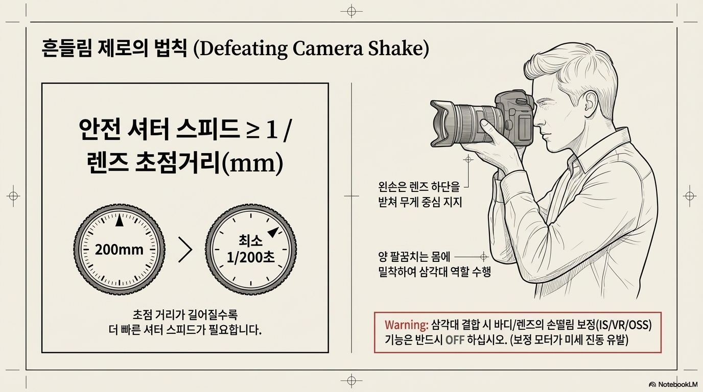 - 50mm 렌즈 사용 시: 최소 1/50초 이상의 셔터 스피드를 확보하는 것이 흔들리지 않는 최후의 마지노선입니다.