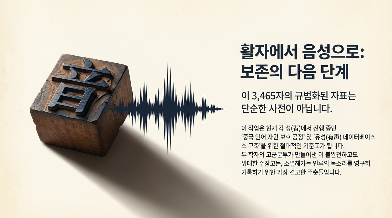 본 공정은 교육부 언어문자 정보관리사와 중국 언어 자원 보호 연구 센터의 주도하에 장진흥, 하서 교수 등 당대 최고의 방언학자들과 **청화대학교 컴퓨터 공학팀(이연자, 장붕 교수)**의 기술적 지원이 결합된 국가적 결실입니다. 체계적으로 정리된 3,465자의 방언 용자는 향후 인공지능 기반 음성 인식 및 방언 번역 시스템의 표준 모델이 될 것입니다. 실무자 여러분의 엄밀한 기록이 중국 언어학의 표준을 선도하는 강력한 도구가 될 것임을 확신합니다.