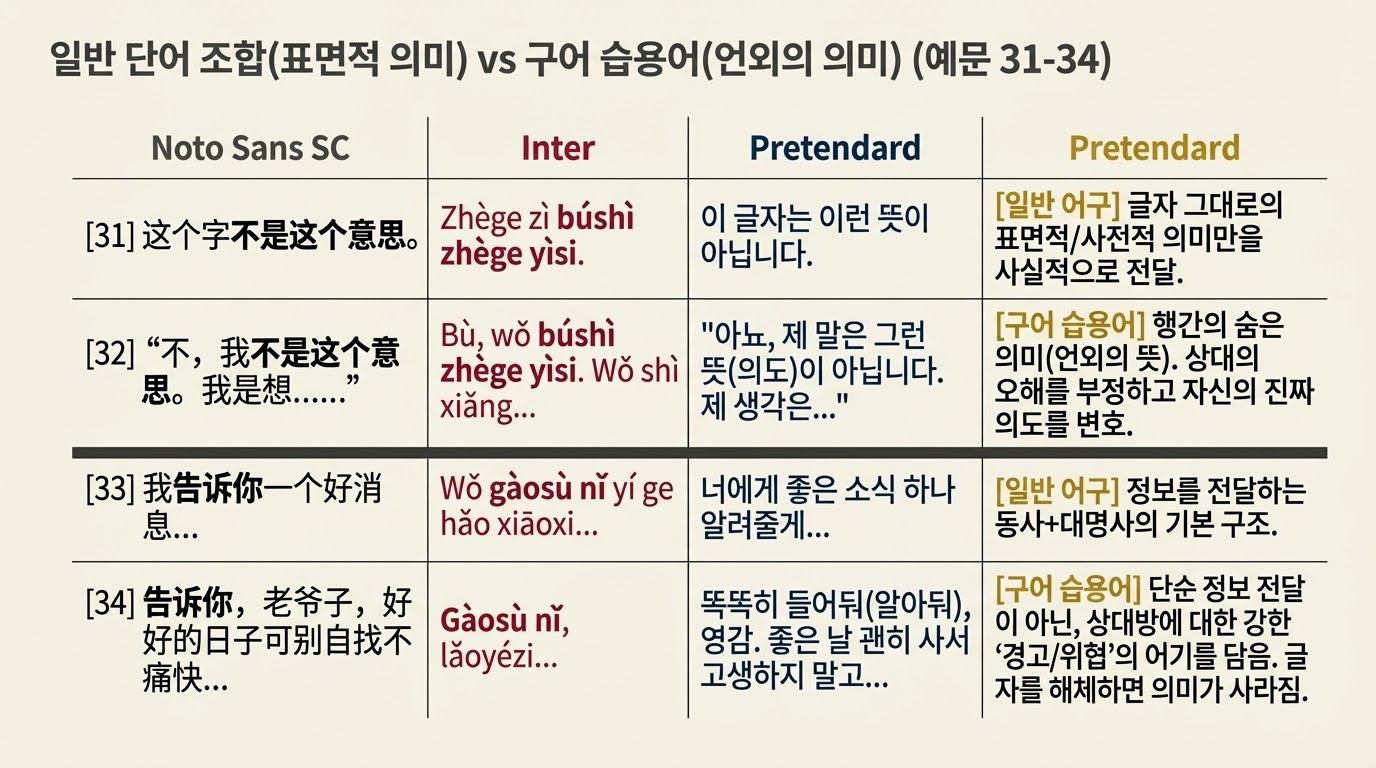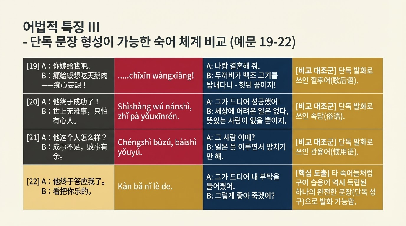 학습자가 이 위계를 파악해야 하는 이유는 명확합니다. 구어 습용어는 성어나 속담보다 문법적 유연성은 높지만, 특정 상황에 고착된 '약속된 속뜻'을 지니고 있어 이를 놓치면 소통의 본질적 의도를 오독하게 되기 때문입니다.