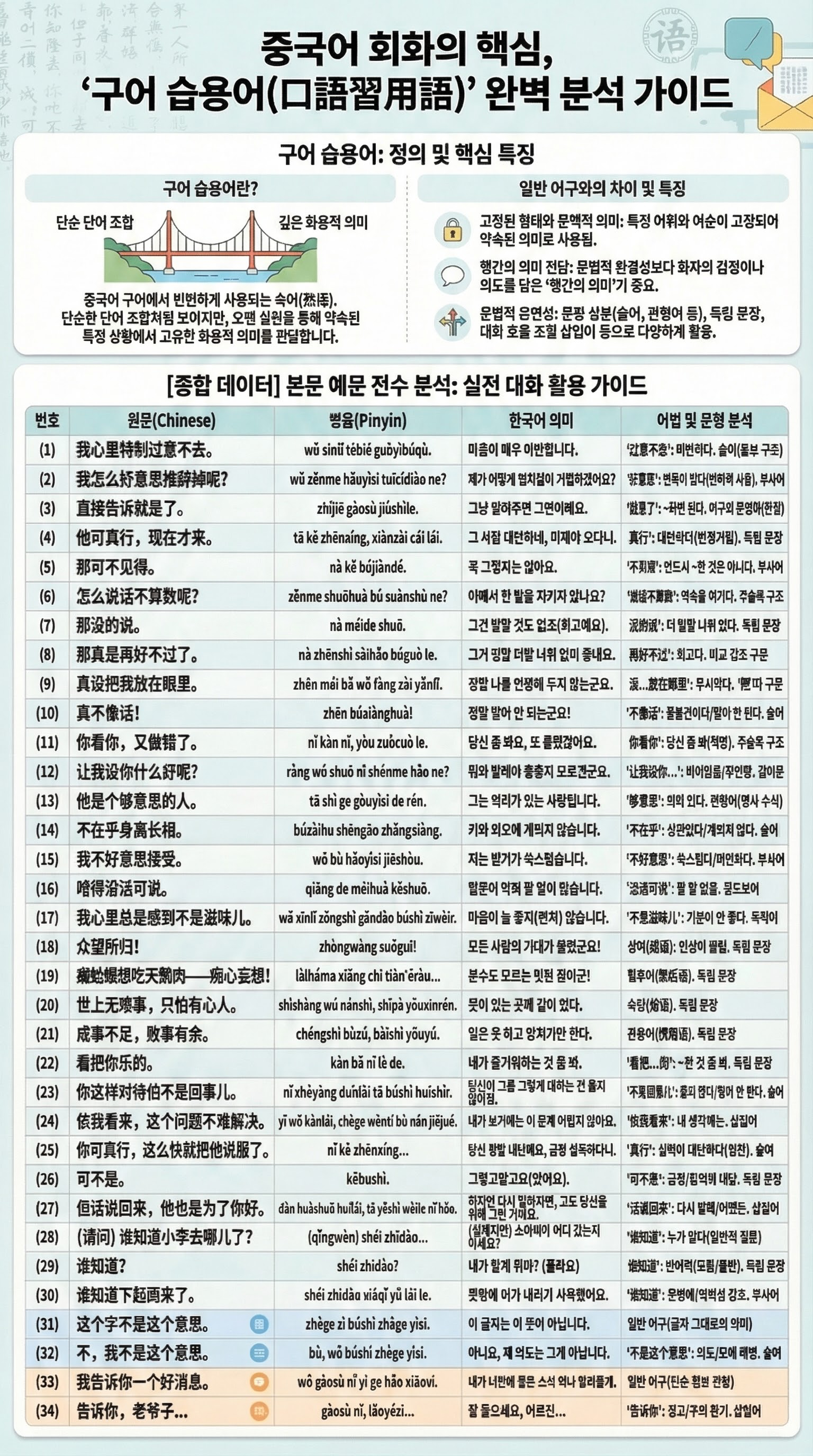 본 가이드는 중어중문학의 교육공학적 관점에서 복잡한 숙어 체계를 재정립하고, 그중에서도 가장 유연하면서도 까다로운 '구어 습용어(口語習用語)'를 마스터하기 위한 체계적인 논리를 제시합니다.