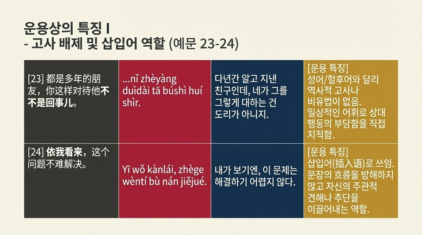 - 삽입어(Insertion) 기능: '也就是说', '依我看来', '叫我说'와 같이 문장 중간에 삽입되어 대화의 흐름을 조절하고 발언권을 유지하는 장치로 활용됩니다. 이는 다른 숙어 범주에서는 보기 드문 구어 습용어만의 독보적 특징입니다.