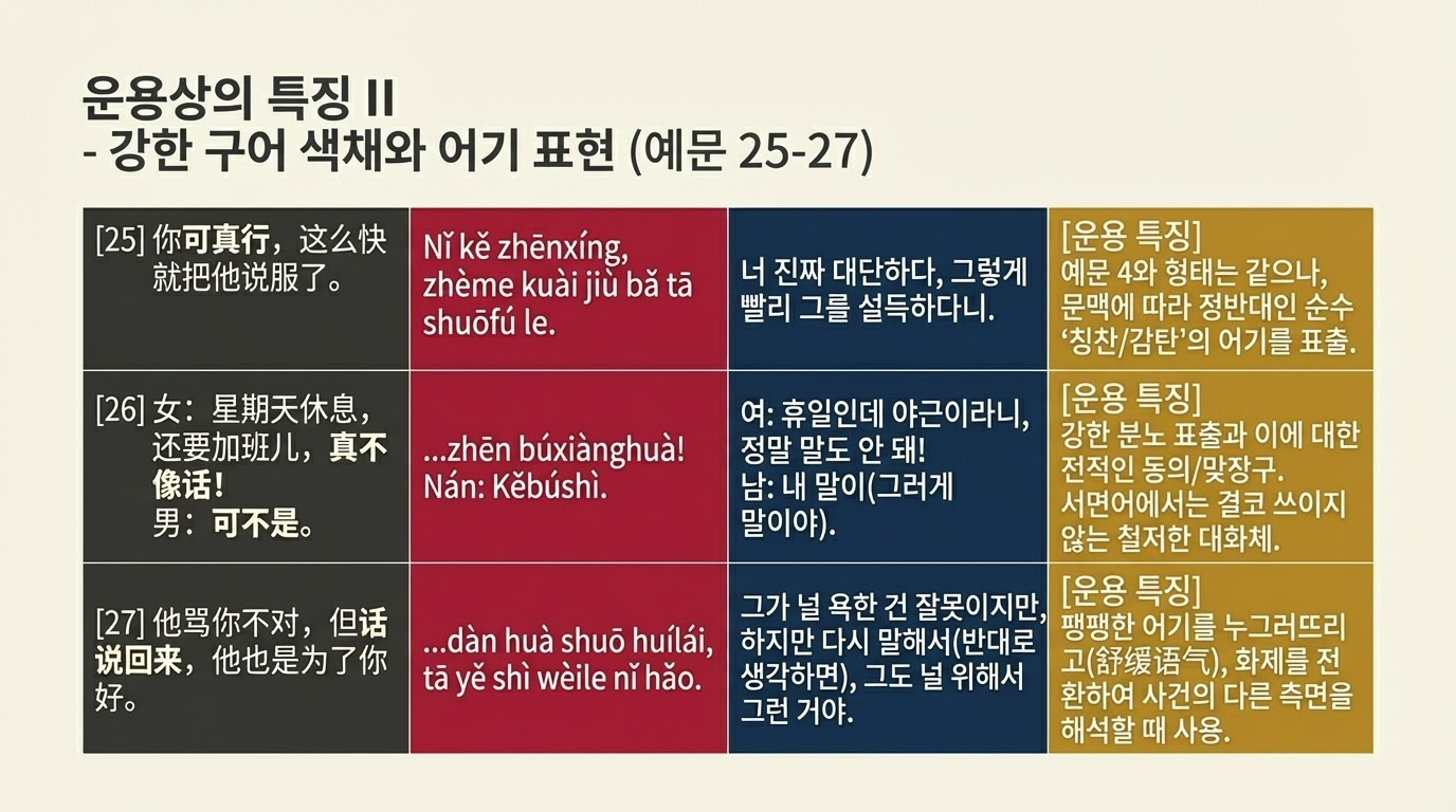 - 사례: "那没的说(더할 나위 없다)", "再好不过了(이보다 좋을 수 없다)" 등은 문법적 규칙성보다는 관용적 정형성이 우선시된 표현이다. 학습자가 흔히 사용하는 "太好了"와 같은 규칙적인 표현보다 훨씬 강한 긍정과 찬탄의 뉘앙스를 담고 있다.