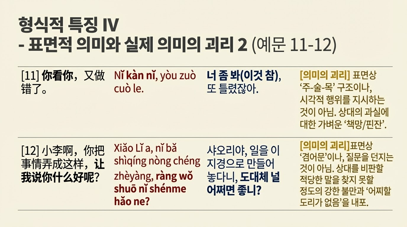 | 11 | 你看你,又做错了 | nǐkàn nǐ, yòu zuòcuòle | 너 좀 봐, 또 틀렸잖아. | 你看你: 주술빈 구조, 상대의 과실을 책망. |
