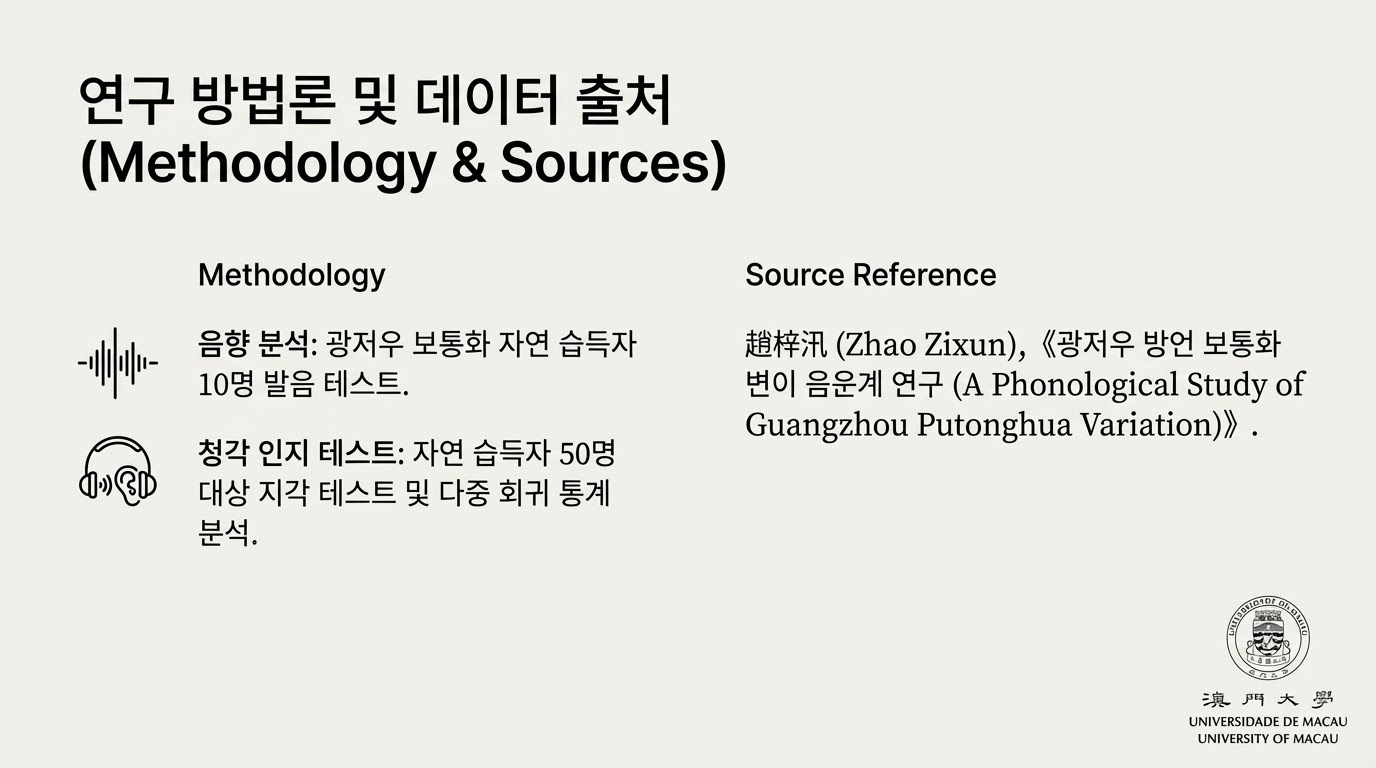 본 가이드는 조자훈(趙梓汛)의 박사 학위 논문인 「광주 방언 보통화 변의 음계 연구(廣州方言普通話變異音系研究)」를 바탕으로 제작되었습니다. 이 자료는 광주 지역의 보통화 자연 습득자들이 사용하는 음계의 본질과 특징, 그리고 그 형성 기제를 이해하는 데 목적이 있습니다.