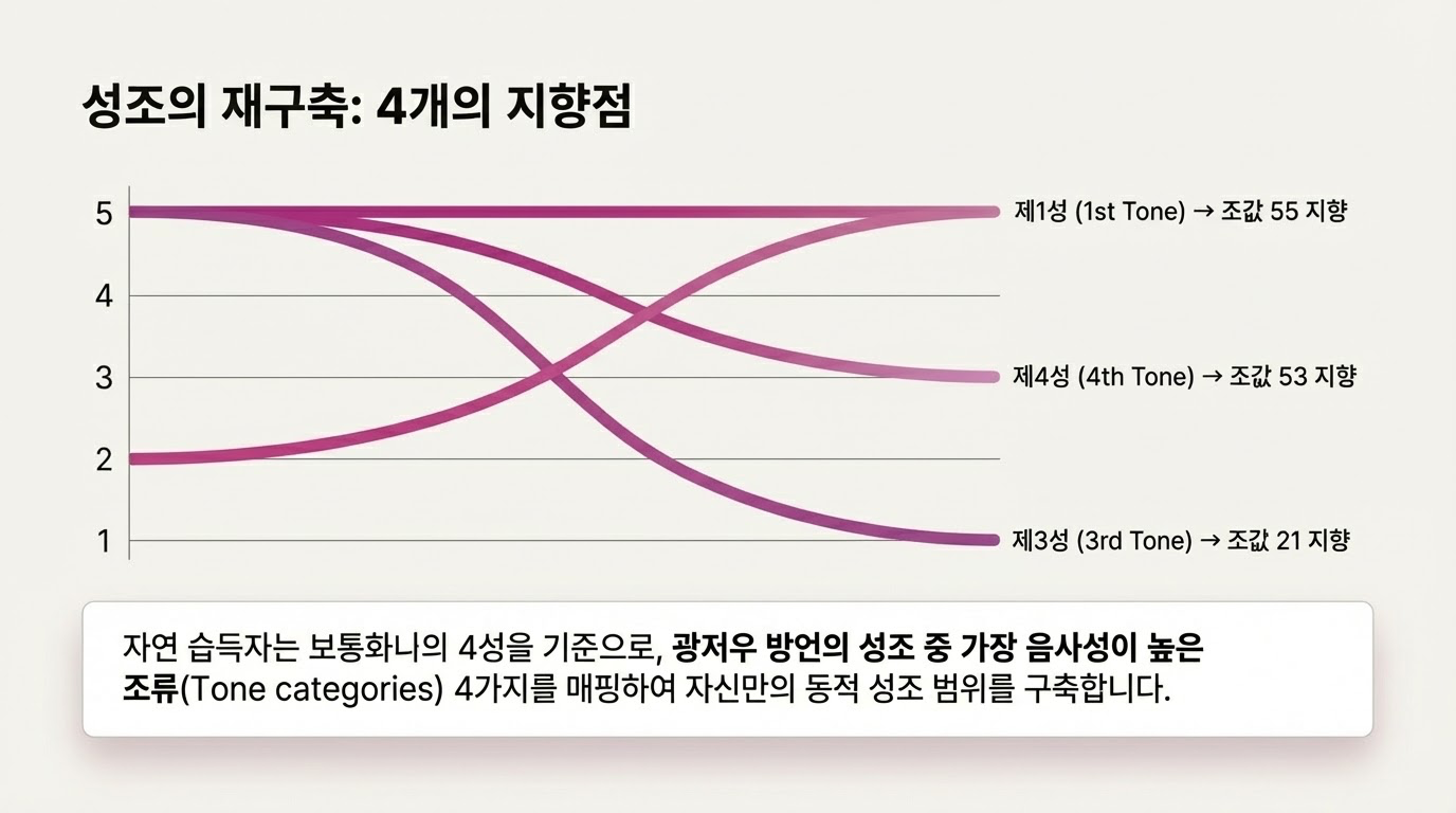광주 보통화 사용자는 보통화의 4성 체계를 인지할 때, **"광주 방언 내에서 보통화와 가장 유사한 성조"**로 치환하여 사용합니다. 이는 철저히 음성 유사성에 기반한 결과입니다.