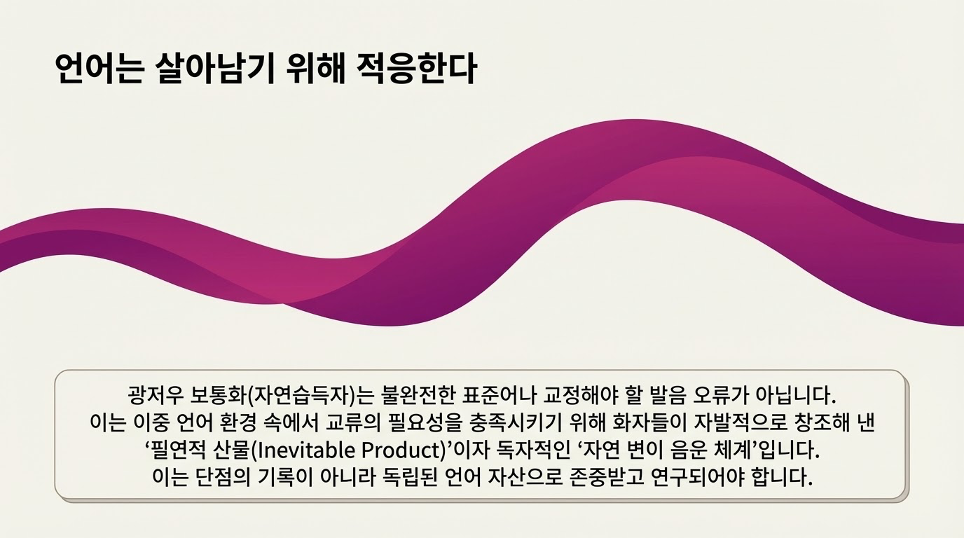 광주 보통화는 인위적으로 제거해야 할 '중간 단계의 오류'가 아닙니다. 그것은 광주라는 특수한 사회언어학적 토양 위에서 화자들이 소통의 필요를 충족하기 위해 자발적으로 창조해낸 **'필연적 결과물'**입니다.