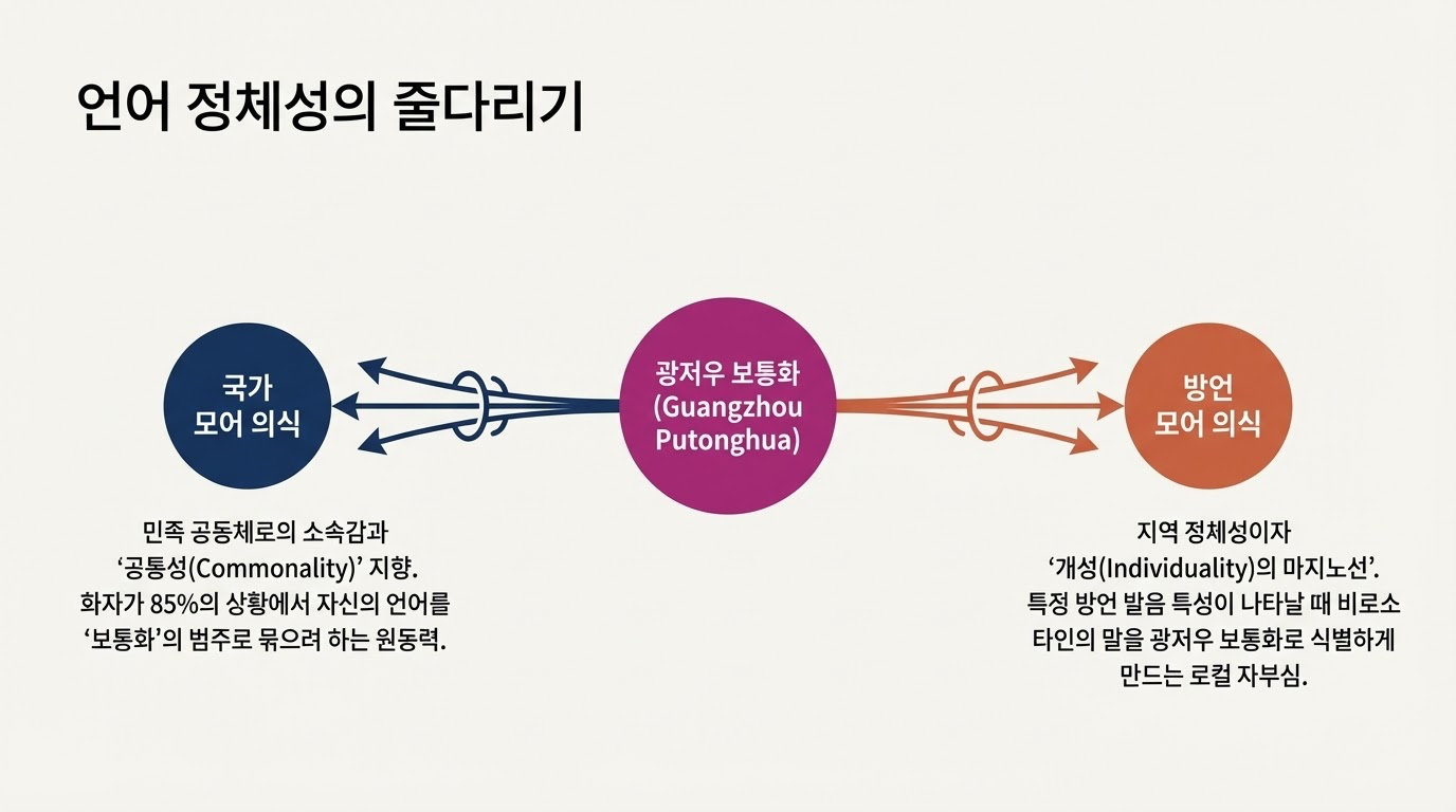 - 방언 모어 의식 (Dialect Mother Tongue Awareness): 자신의 뿌리인 광둥어의 독특함을 유지하려는 심리적 마지노선입니다. 특정 발음이나 억양에서 광둥어의 색채를 남겨둠으로써 "나는 보통화를 구사하는 광둥 사람"이라는 정체성을 드러냅니다.