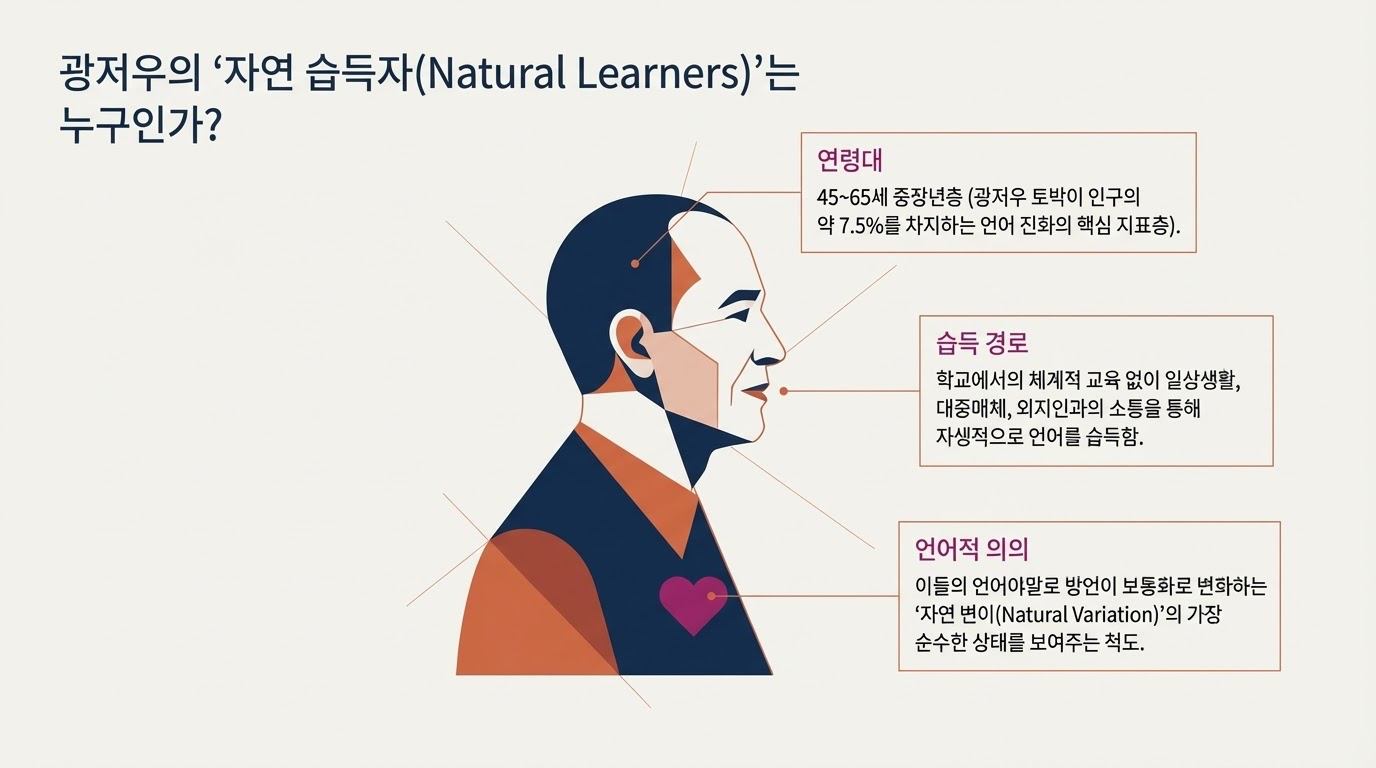광주 보통화의 핵심적인 특징을 가장 잘 보여주는 집단은 바로 **'자연 습득자'**입니다. 이들은 광주 보통화의 '자연스러운 변이 상태'를 가장 순수하게 대표하는 분들입니다.