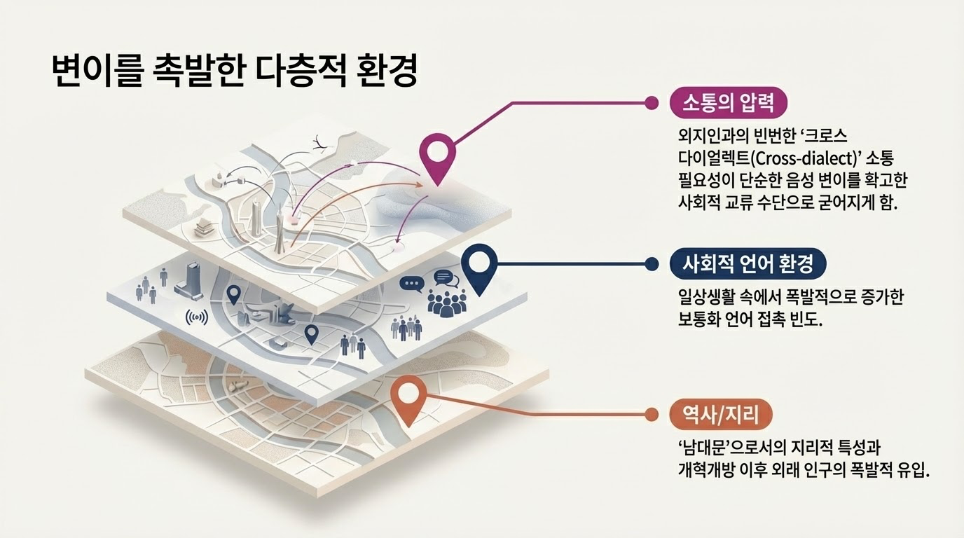 - 필연적 형성: 방언과 보통화 사이의 내적 음운 공통성과 광주의 사회지리적 환경이라는 외적 요인이 결합하여, 의사소통 효율성을 극대화하기 위한 자발적 변이 체계가 형성되었다.