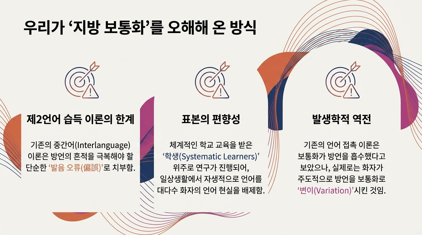표준 보통화는 북경음을 표준음으로 규정하지만, 실제 광주 화자들은 일상적 소통에서 이 기준과 계통적 괴리를 보이는 '광주 보통화'를 사용합니다. 이를 제2언어 습득(SLA) 관점의 '부정적 전이'에 의한 편오(Error)로 규정하는 것은 실제 화자들의 언어 전략을 간과한 것입니다.