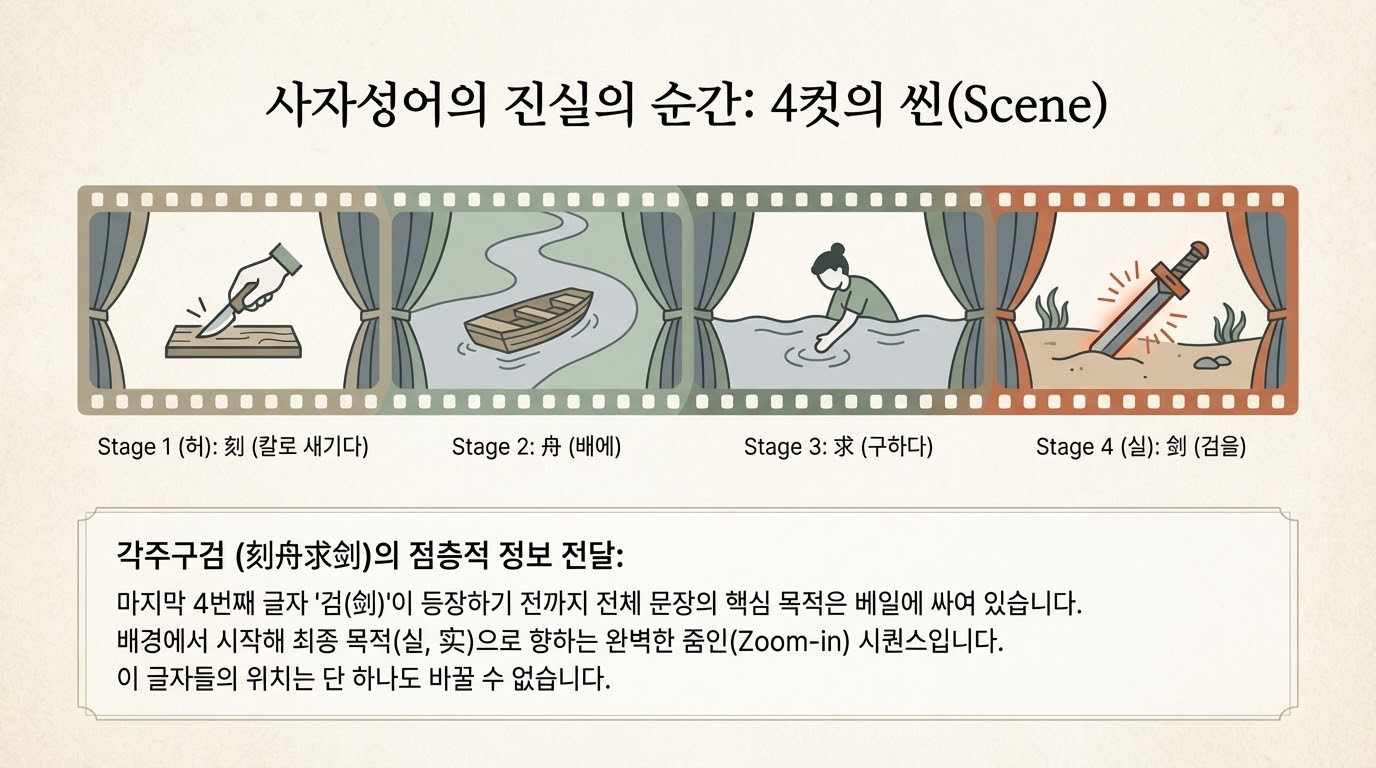 이 문장에서 '나'가 '내일'보다 앞에 오는 이유는 화자인 내가 현재 존재해야 미래의 사건이 성립하기 때문입니다. '내일'이 '아침'보다 먼저인 이유는 더 큰 시간의 틀이 먼저 존재해야 그 안의 구획이 나뉘기 때문입니다. 성어 '각주구검(刻舟求剑)'이나 '수주대토(守株待兔)' 역시 각 글자가 하나의 사건 화면을 구성하며, 이 순서가 뒤섞이는 순간 이야기의 인과관계는 붕괴됩니다.