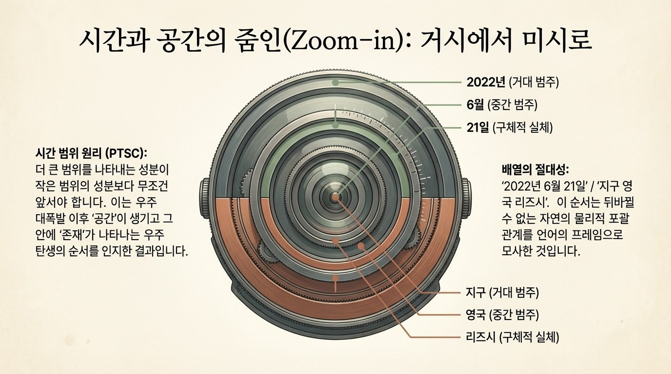 - PTSC (Principle of Temporal Scope): 넓은 테두리(큰 범주)를 먼저 설정하고 그 안의 구체적인 지점(작은 단위)으로 좁혀 들어가는 방식입니다.
