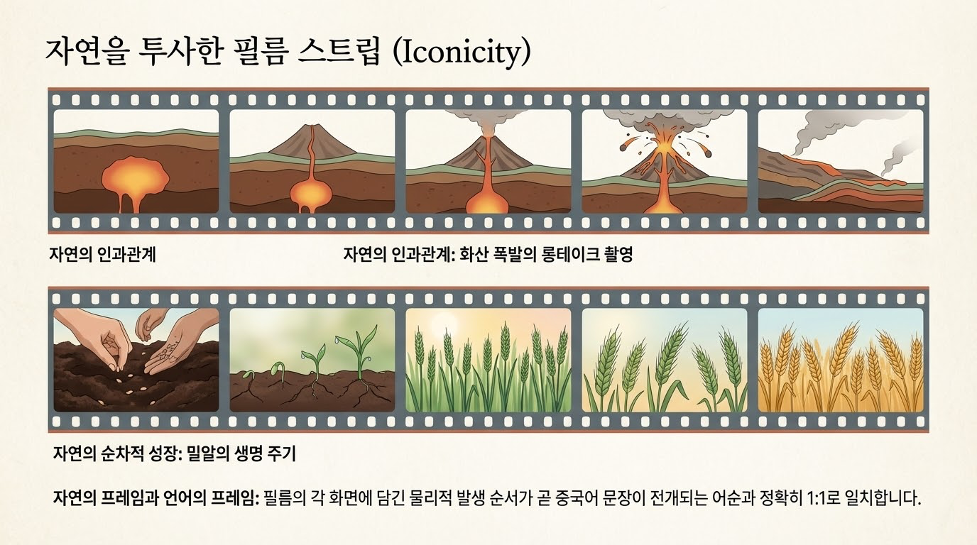 - 물리적 실재의 반영: 중국어 문장은 편집되지 않은 '영화 필름의 프레임'입니다. 영어는 "He came by bus"처럼 결과를 먼저 말할 수 있으나, 중국어는 반드시 수단이 발생한 후 결과가 옵니다.