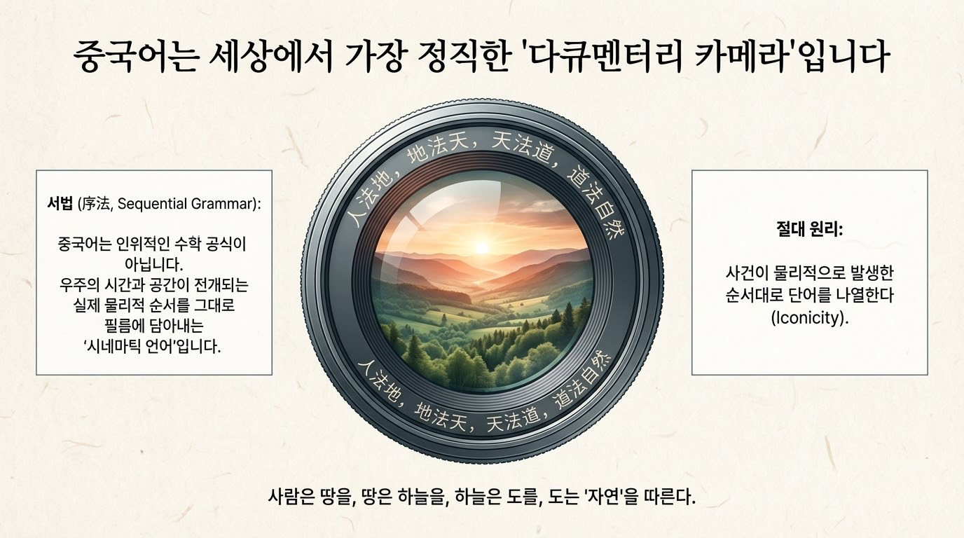 중국어 어순은 단순한 관습이 아닌 '도법자연(道法自然)'의 원리에 따라 형성된 물리적·철학적 질서의 반영입니다.