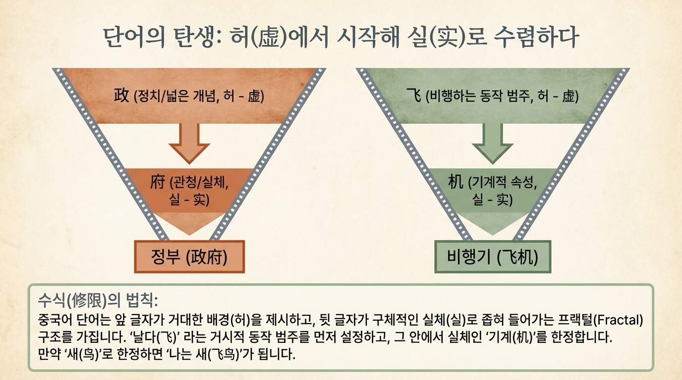 - 단어 형성의 논리(Morpheme Logic): 이 원리는 단일 단어 안에서도 발견됩니다. '정부(政府)'나 '정책(政策)'에서 '정(政, 정치)'은 넓은 범주(허)이고, '부(府)'나 '책(策)'은 구체적인 형태(실)입니다. '비행기(飞机)' 역시 '날다(飞, 허)'라는 행위가 '기계(机, 실)'의 속성을 먼저 규정합니다.
