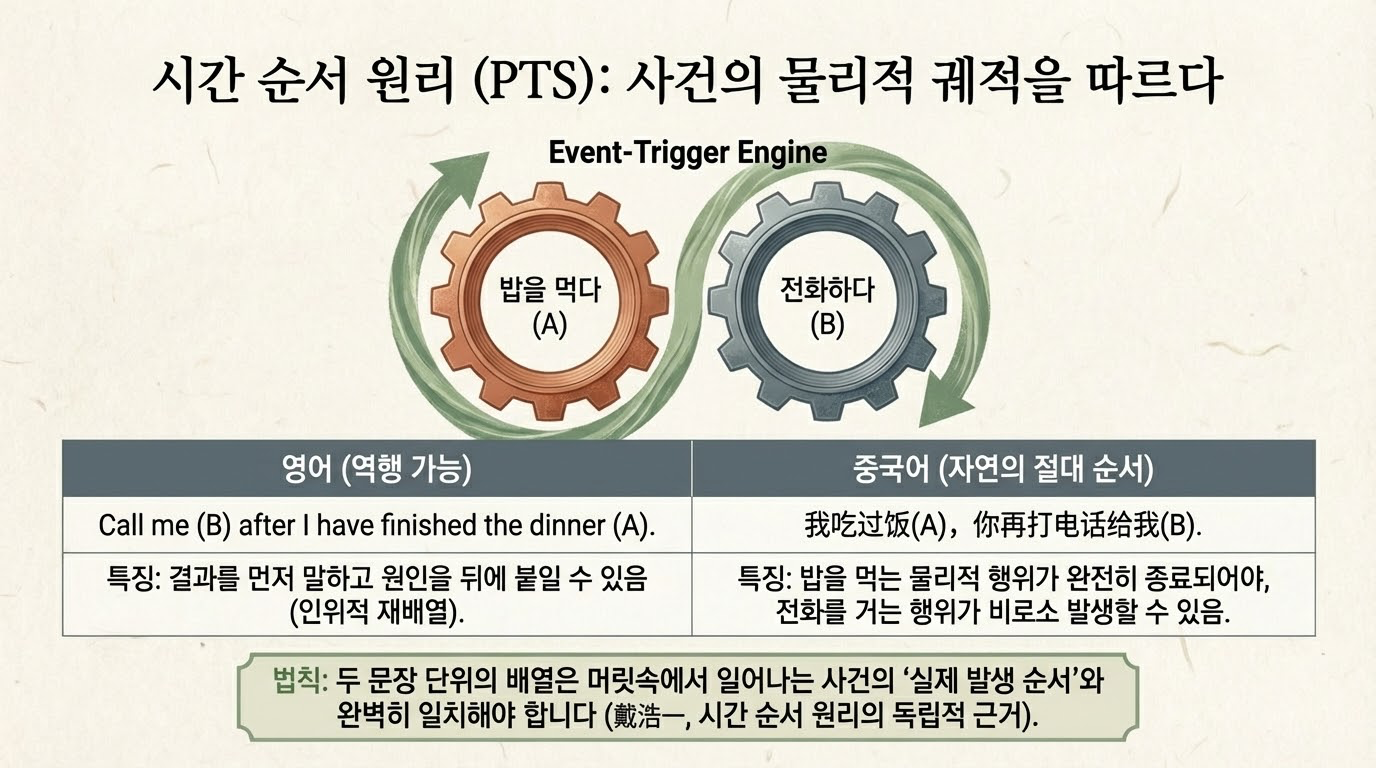 다이 하오이(戴浩一)가 제안한 **시간 순서 원리(Principle of Temporal Sequence, 이하 PTS)**는 “언어적 단위의 배열 순서는 실제 개념 세계에서 발생하는 사건의 시간적 순서와 일치한다”는 도상적 원리를 천명한다. 이는 중국어 어순이 화자의 주관적 선택이 아닌, 객관적 사건 흐름에 대한 ‘직접 투사(Direct Mapping)’임을 시사한다.