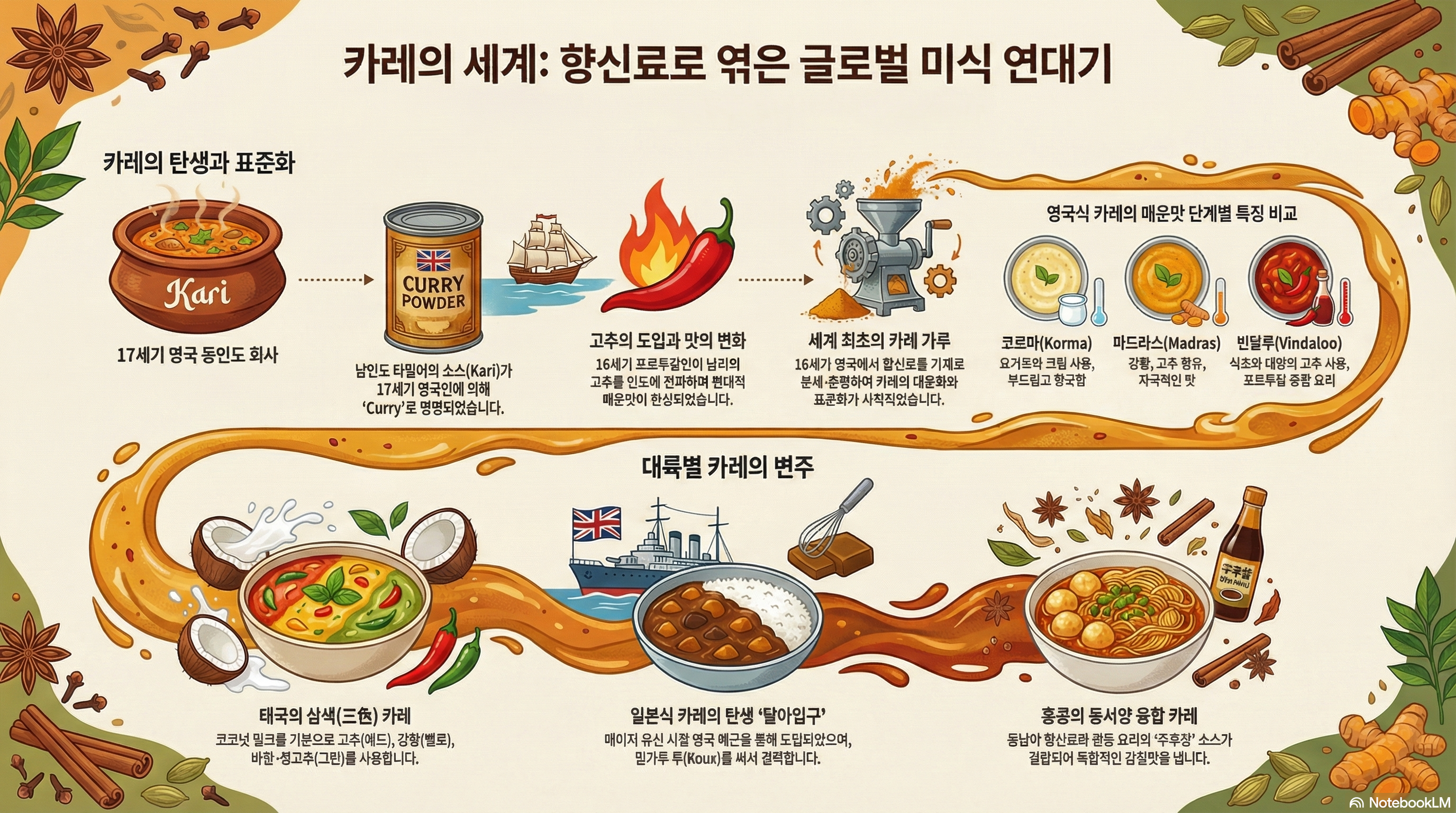 본 가이드는 카레의 기원부터 인도, 영국, 동남아시아, 홍콩, 그리고 일본에 이르기까지 카레가 어떻게 전파되고 각 지역의 특색에 맞게 변모했는지에 대한 심층적인 이해를 돕기 위해 제작되었습니다.