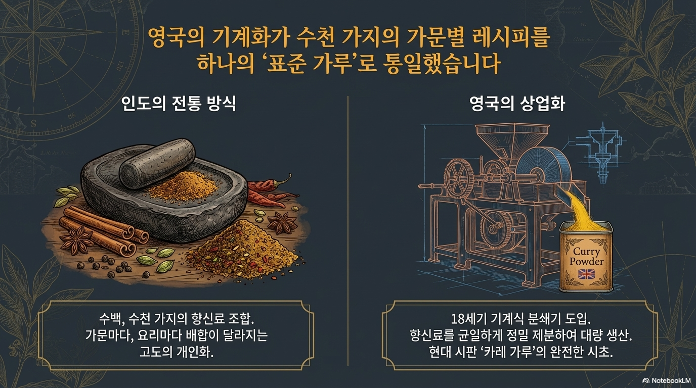 인도의 전통적인 향신료 조합은 각 가정의 비법에 따라 수천 가지 변주가 가능한 '가내수공업'의 영역이었습니다. 하지만 영국인들은 이 복잡하고 무질서한 다양성을 상업적 효율성 안으로 끌어들이고자 했습니다.