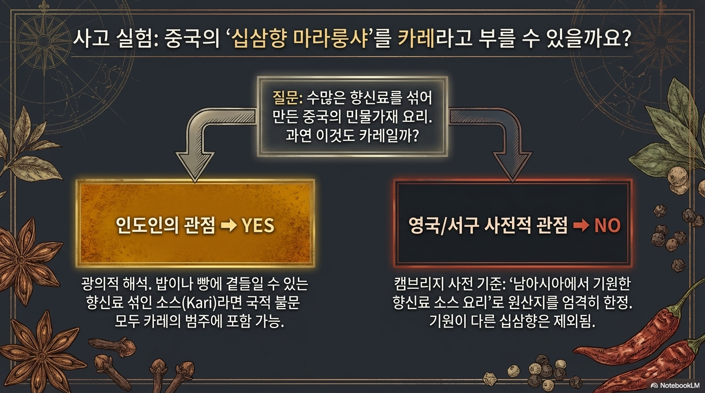 예컨대 중국의 **'13향 소룡포(13-Spice Crayfish)'**는 향료를 사용한 매콤한 소스 요리라는 점에서 인도적 정의에는 부합하나, 남아시아라는 지리적 기원과 강황·생강 중심의 향료 계보에서 벗어나 있기에 영어권 정의에 따른 '커리'에는 해당하지 않습니다. 결국 커리는 고정된 레시피가 아니라, 지난 500년간 인류가 겪은 이주와 융합의 역사가 접시 위에 구현된 유동적인 문화적 실체입니다.