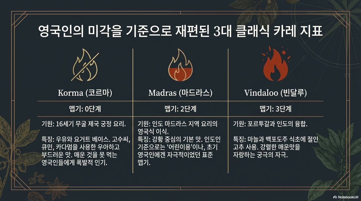 영국은 이를 통해 커리의 맛을 세 가지 표준 카테고리로 분류했습니다.