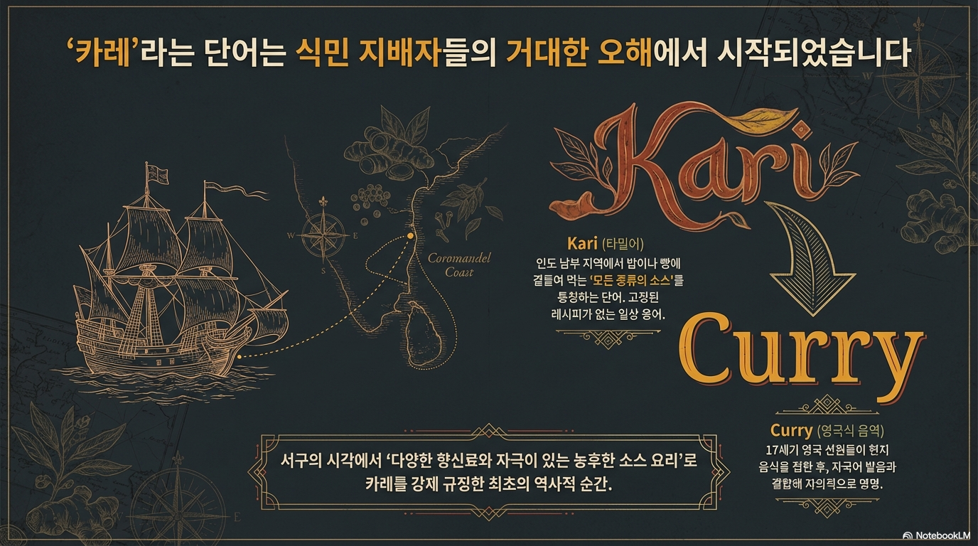 이러한 명명은 식민지 지배라는 거대한 시대적 배경이 낳은 언어적 파편이었습니다. 인도인들에게 '카리'는 특정한 요리명이 아닌 '밥에 비벼 먹는 소스'라는 기능적인 명사였으나, 영국인들은 이를 하나의 고유한 요리 카테고리로 규정하며 현대적 의미의 카레를 탄생시켰습니다.