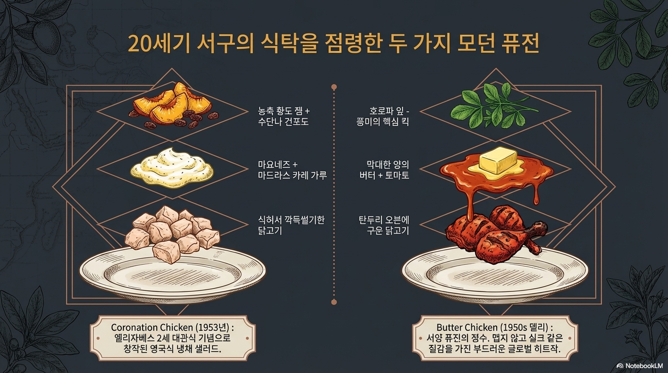 - 가미안 치킨(Coronation Chicken): 1953년 엘리자베스 2세 대관식을 위해 고안된 '영국식 냉수 마찰 커리' 모델입니다. 마요네즈, 커리 가루, 농축 황복숭아 잼, 건포도가 결합된 차가운 샐러드 형태로, 영미권의 냉식(冷食) 커리 시장을 상징합니다.