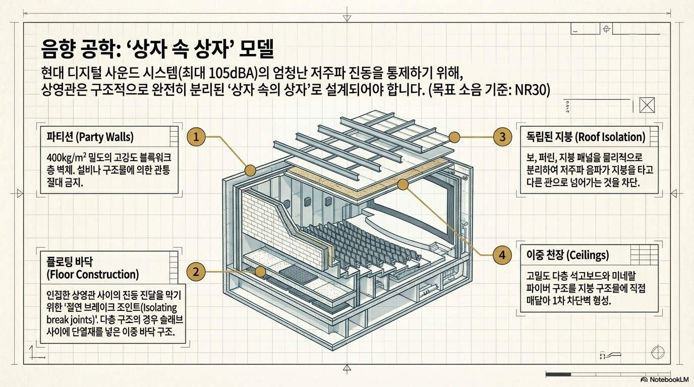이를 해결하기 위해 건축가는 **'Box within Box'**라는 건축적 분리(Decoupling) 원리를 사용합니다. 이는 건물 외벽(Outer Box) 안에 상영관이라는 독립된 상자(Inner Box)를 다시 짓는 방식입니다. 마치 소음의 폭풍우 속에 고요한 섬을 만드는 것과 같습니다.