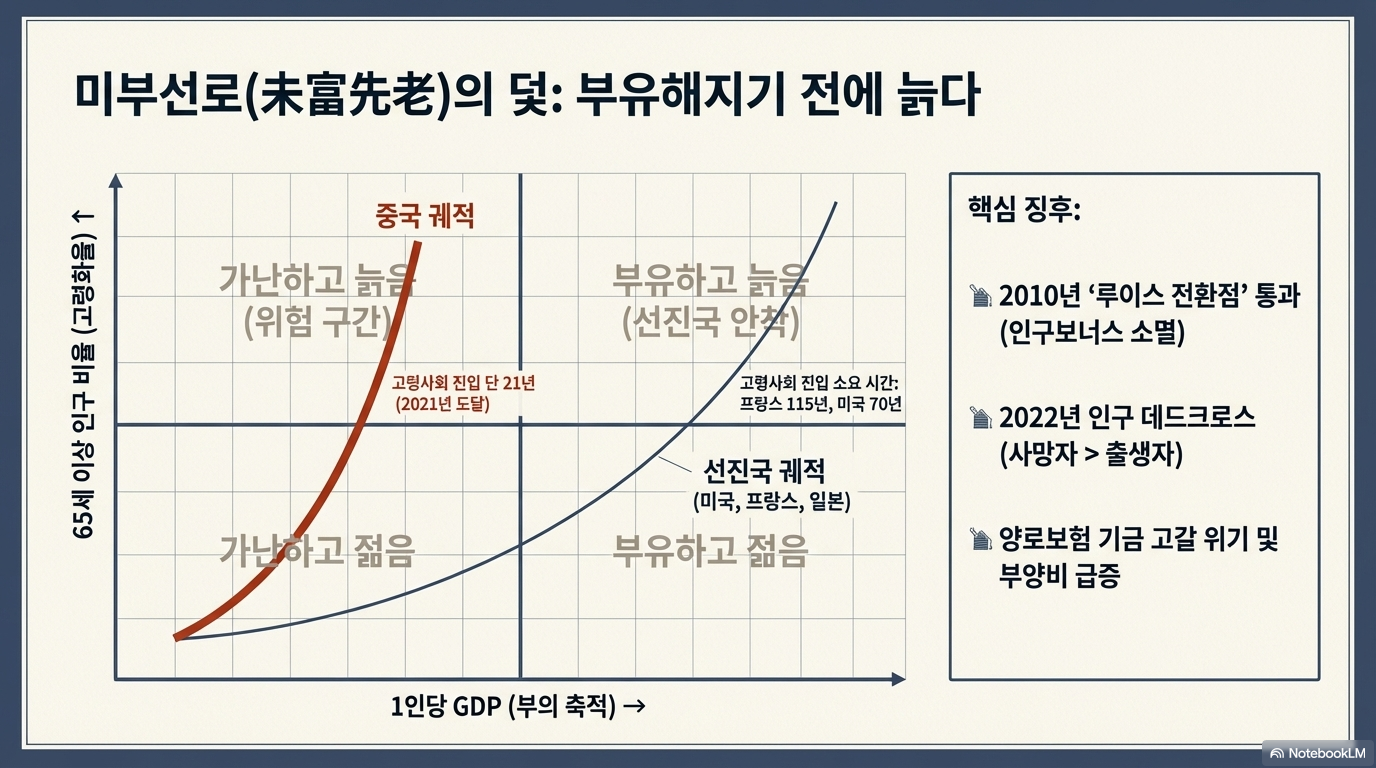 - 고령사회 진입 속도 비교: 고령화 사회에서 고령 사회로 가는 데 프랑스는 115년이 걸렸지만, 중국은 단 21년이 걸렸습니다. 이는 **한국(18년)**과 비견될 정도로 압도적인 속도이며, 사회 안전망이 부족한 상태에서 엄청난 재정적 부담을 야기합니다.