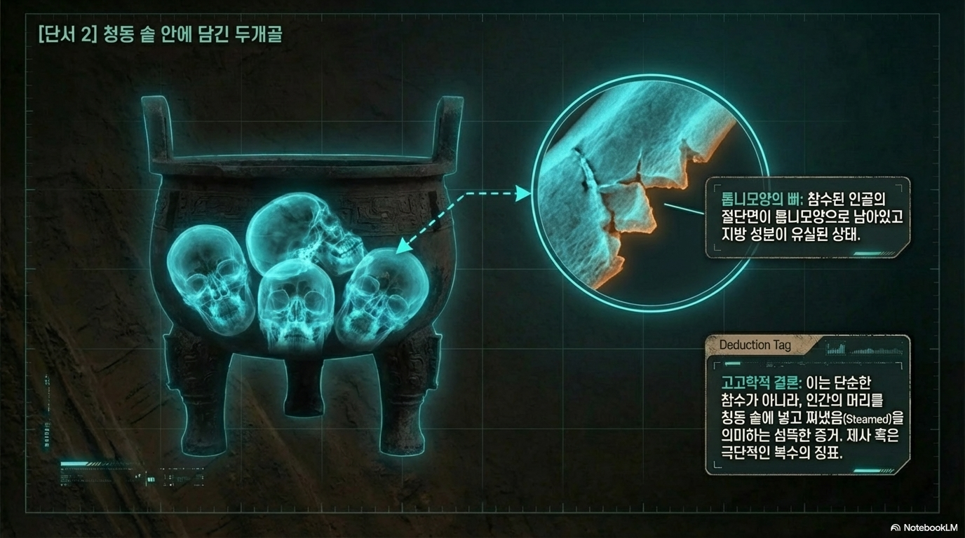 - 식물(食人) 제례의 과학적 증거: 청동 정(鼎)과 증(甑, 시루) 내부에서 발견된 인골의 절단면은 매우 매끄러운(齊) 특징을 보입니다. 이는 생인골의 톱니 모양 절단면과 구별되는 것으로, 인골이 고온에서 '쪄진(steamed)' 상태에서 분리되었음을 과학적으로 입증합니다. 상나라의 인신공희는 단순한 살해를 넘어, 신에게 바치는 정제된 조리 과정으로서의 잔혹성을 내포하고 있었습니다.