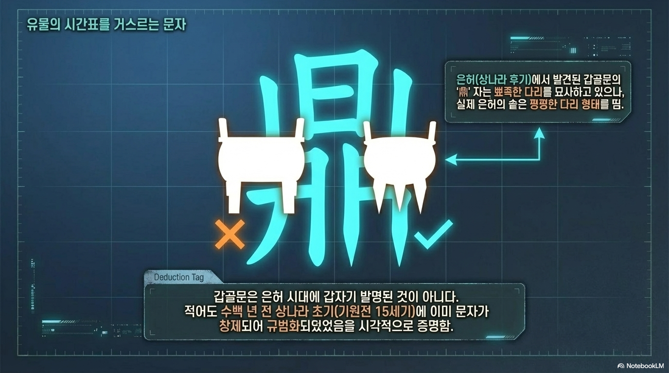 - 고문헌학적 통찰: 흥미로운 점은 후기 은허의 갑골문에서 '솥 정(鼎)' 자의 형상은 여전히 뾰족한 다리를 가진 중기 도기의 형태를 유지하고 있다는 것입니다. 이는 도기의 실물 양식은 변했어도, 문자의 원형은 기술적 정점이었던 상나라 중기에 이미 규격화되어 고착되었음을 보여주는 '문자적 화석' 증거입니다.