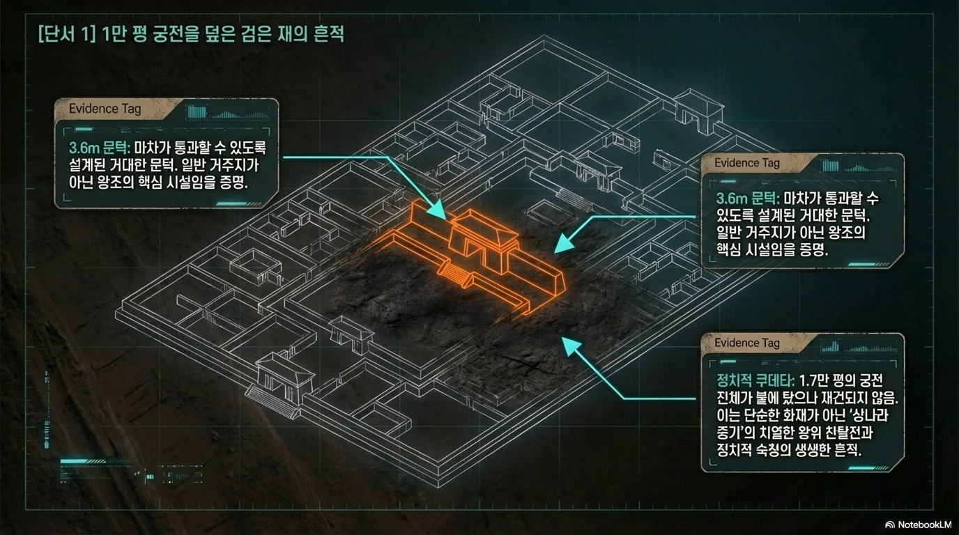 - 재건의 부재와 왕조의 포기: 가장 결정적인 고고학적 증거는 화재 이후의 '침묵'입니다. 이토록 화려하고 거대한 도성이 화재 이후 단 한 차례도 재건되지 않고 방치되었습니다. 이는 단순한 재난을 넘어 왕조의 정통성이 붕괴되거나 권력의 중심이 급격히 이동했음을 뜻합니다.