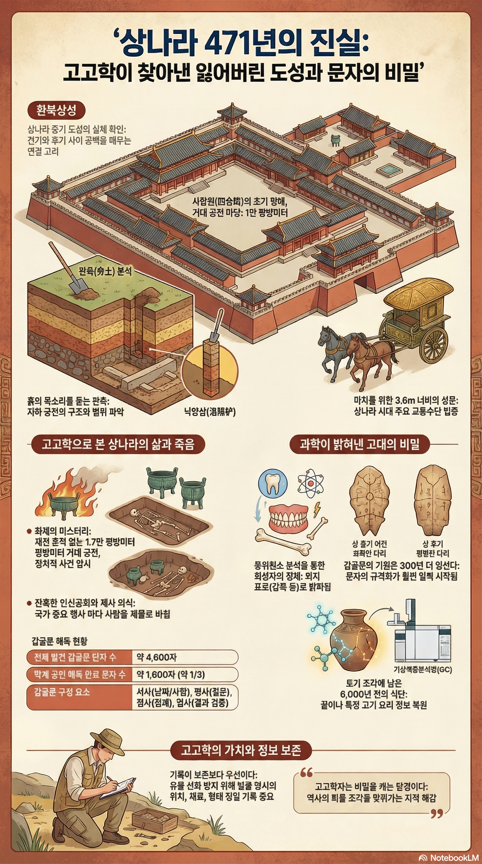 본 가이드는 상나라(상조)의 고고학적 발굴 성과, 고대 문명 연구 방법론, 그리고 유물 보존 및 해석에 관한 소스 텍스트의 내용을 종합적으로 정리한 학습 자료입니다.