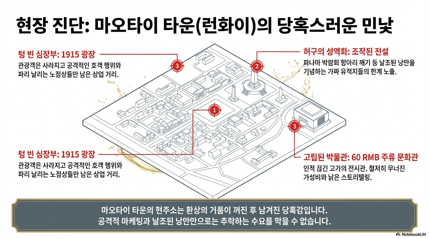 백주 산업의 메카인 귀주성 런화이시는 현재 유령 도시화의 전조를 보이고 있다. 과거의 영광을 상징하던 ‘1915 광장’의 ‘부서진 술병’ 조형물은 이제 브랜드 신화의 몰락을 상징하는 기괴한 유적으로 전락했다. 관광객이 끊긴 ‘중국 주문화성’ 박물관은 60위안이라는 비합리적인 입장료를 고수하며 시대착오적 운영을 거듭하고 있다.