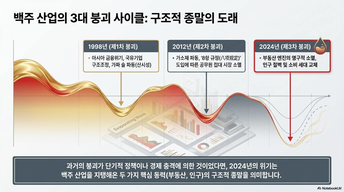 - 산업의 핵심 심결 (부동산과 인구): 백주 산업의 엔진은 맛이 아니라 **"부동산 주기"**와 "인구 구조"였다는 점이 가장 중요한 통찰입니다. 부동산 호황이 끝나고 주 소비층인 50·60년대생이 노령화되면서, 산업은 다시는 **"산 정상"**으로 돌아갈 수 없는 "황혼기"에 접어들었습니다.
