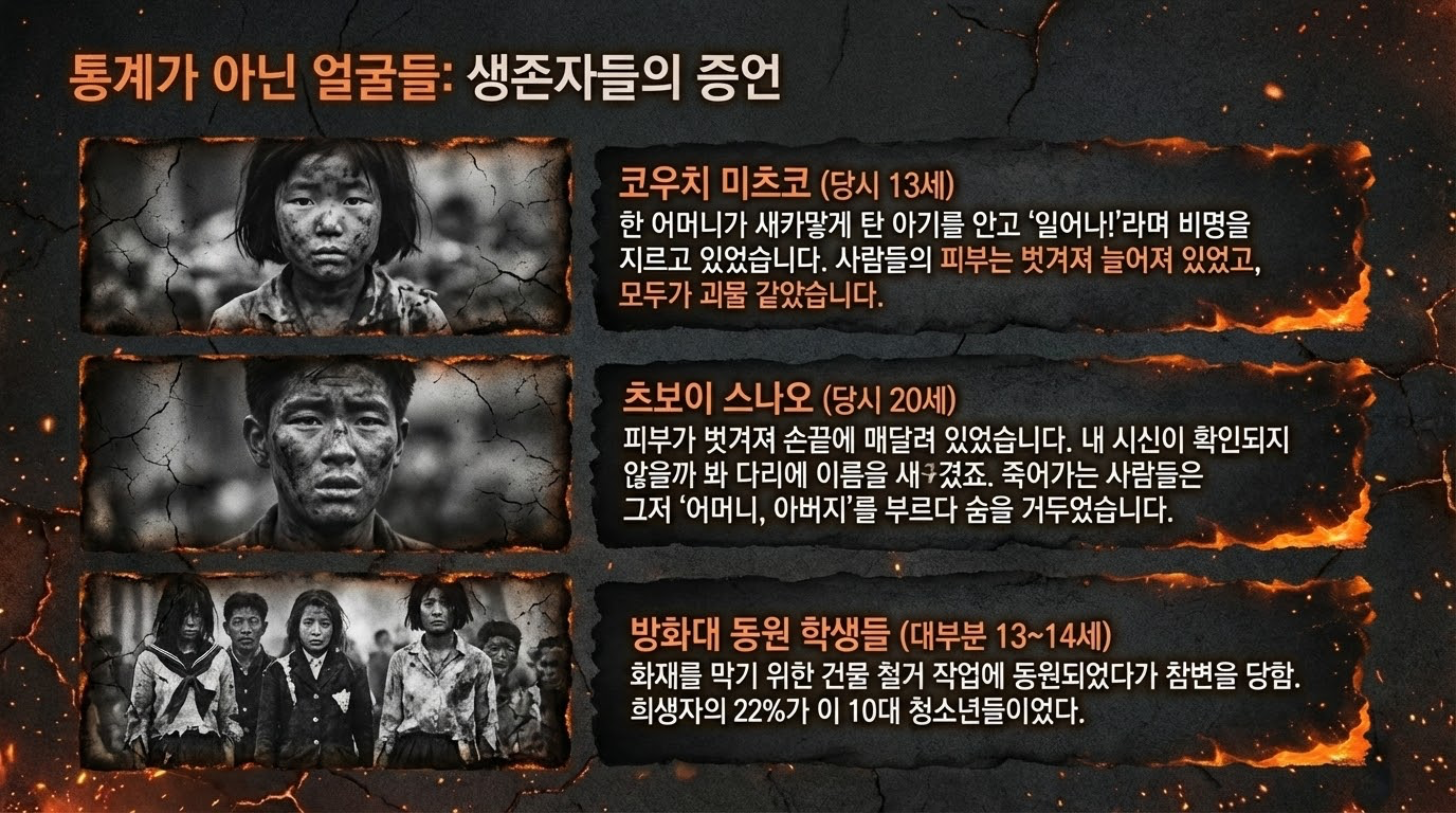 지상 600m 상공에서 터진 리틀 보이는 순식간에 섭씨 6,000도의 열기를 뿜어냈습니다. 폭발 중심지 근처의 생명체들은 비명을 지를 새도 없이 탄화되어 '그림자'만을 남긴 채 증발했습니다.