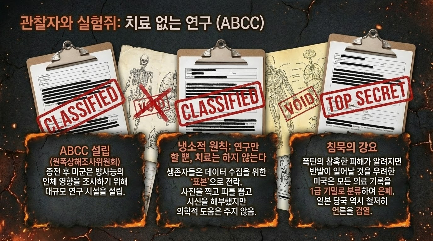 - ABCC의 전략적 위선: 미국은 종전 후 **원폭 상해 조사 위원회(ABCC)**를 설립했으나, 피해자들에 대한 '치료 없는 조사' 원칙을 고수했습니다. 이는 피폭 데이터를 독점하여 자국의 핵전략을 고도화하려는 정보 독점 욕구에서 기인한 것으로, 심각한 윤리적 결함으로 지적됩니다.