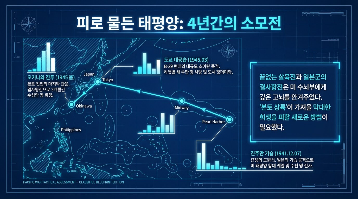 1942년 미드웨이 해전의 승리로 전략적 주도권을 탈환한 미군은 '섬 건너뛰기(Island Hopping)' 전술을 통해 일본 본토로의 포위망을 좁혀갔습니다. 1945년 초 사이판 점령과 이어진 B-29의 도쿄 대공습은 일본의 전쟁 수행 능력을 심각하게 훼손했으나, 일본 수뇌부는 비이성적인 '결사 항전'과 '옥쇄(玉碎)'를 고수하며 저항의 강도를 높였습니다.
