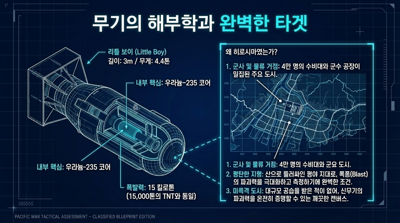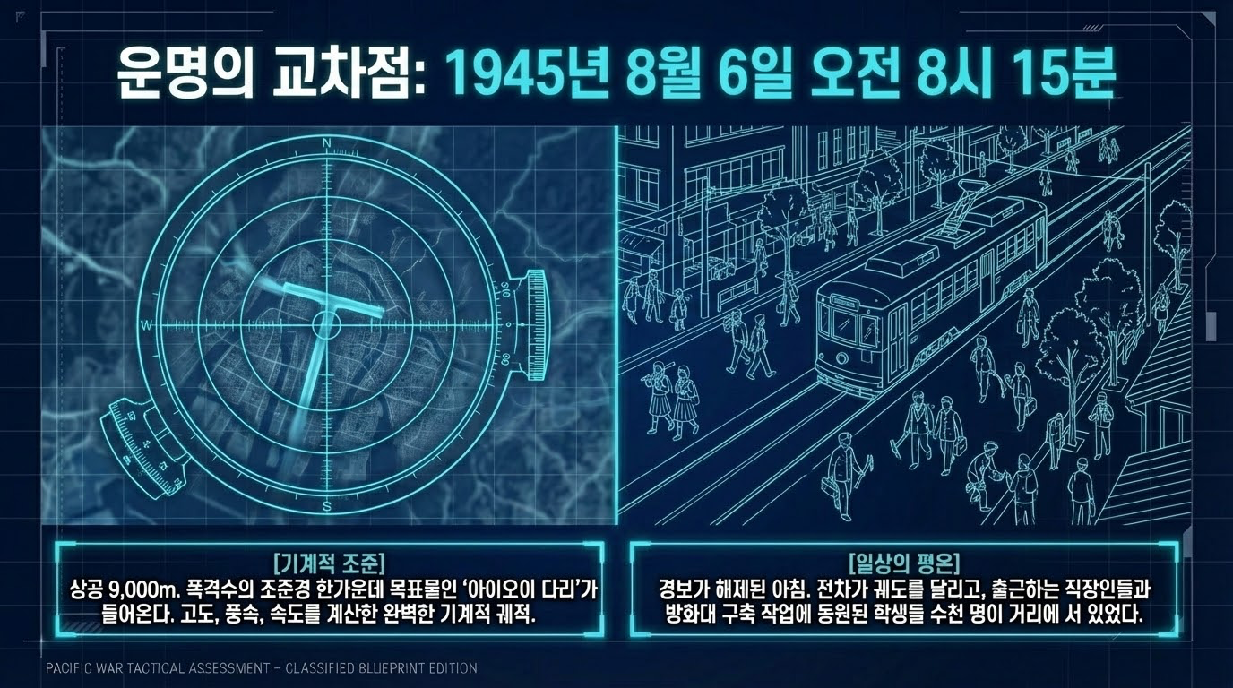 - 08:15: 히로시마 중심부의 T자형 랜드마크인 **'아이오이(Aioi) 다리'**를 조준선 정중앙에 놓고 투하.