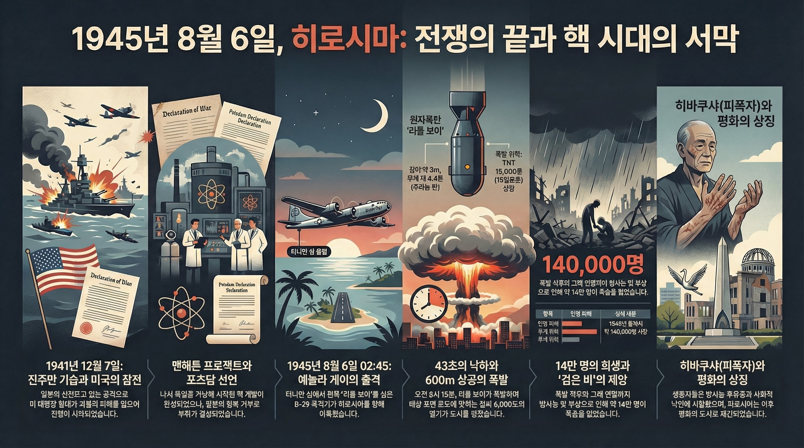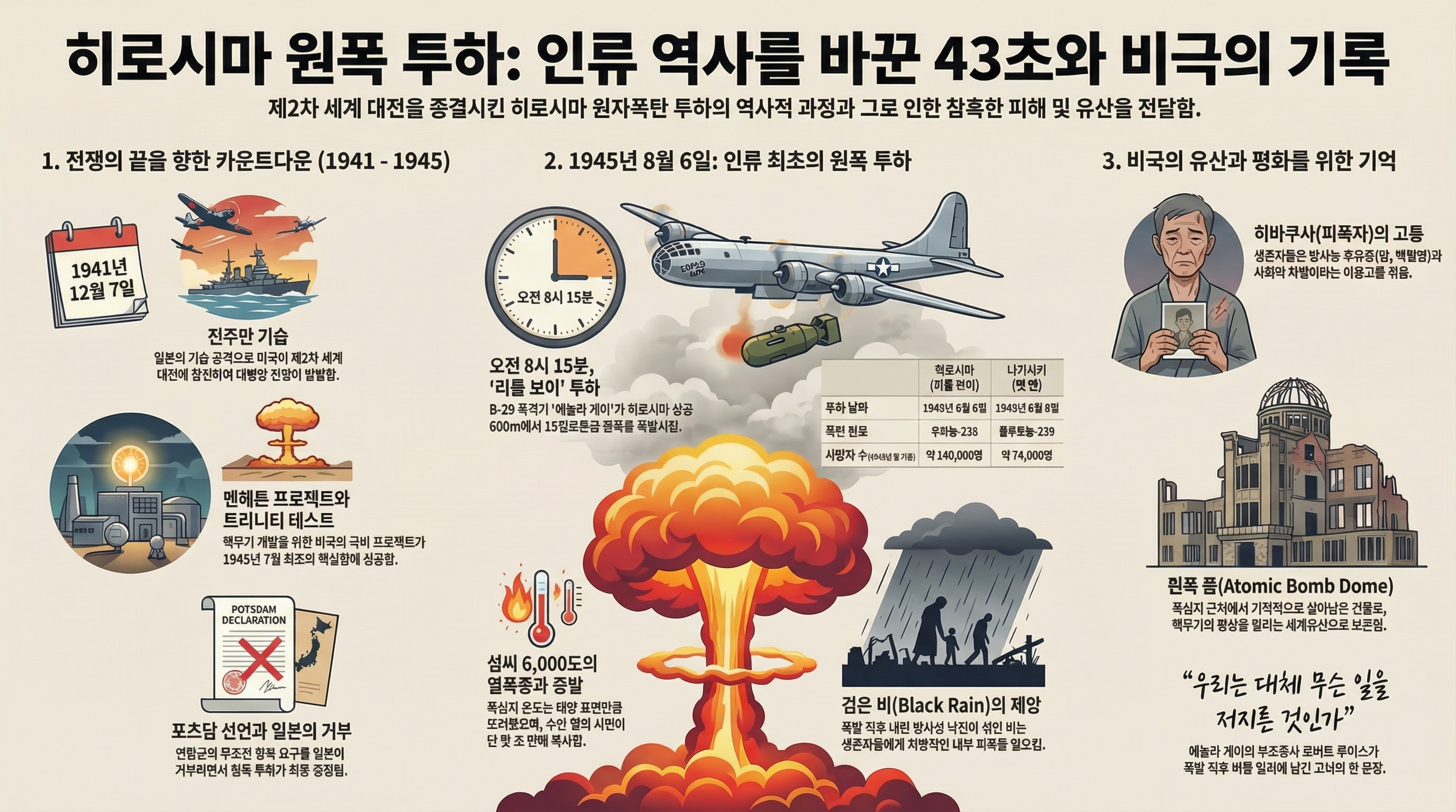히로시마의 비극은 1941년 일본의 진주만 기습으로 시작된 태평양 전쟁의 종착역이었습니다. 미국은 일본의 결사항전 의지를 꺾고 전쟁을 조기에 종결시키기 위해 인류가 한 번도 가보지 않은 길을 선택했습니다.