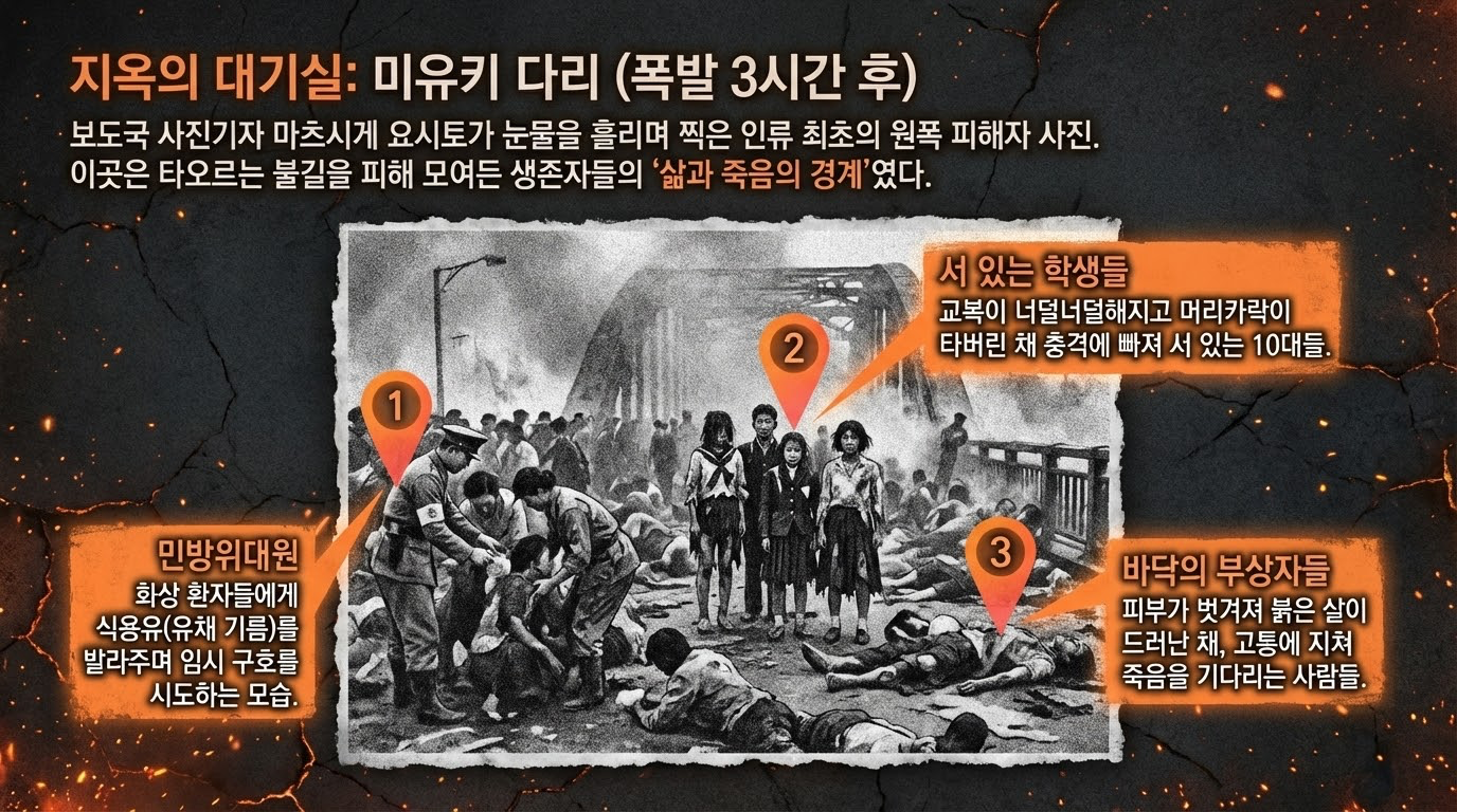 폭발 순간, '피카-돈(Pika-don, 번쩍하고 쾅)'이라 불리는 거대한 섬광과 충격파가 도시를 휩쓸었습니다. 섭씨 6,000도의 열기에 20세 대학생 쓰보이 스나오는 몸이 공중으로 튀어 올랐고, 13세 소녀 코우치 미츠코는 유리 파편에 온몸이 찢긴 채 피로 뒤덮였습니다. 살아남은 이들은 미유키 다리로 모여들었습니다. '삶과 죽음의 경계'가 된 이 다리에서 사진작가 마츠시게 요시토는 너무나 참혹한 광경에 셔터를 누르지 못하고 눈물을 흘리며 단 5장의 사진만을 남겼습니다.