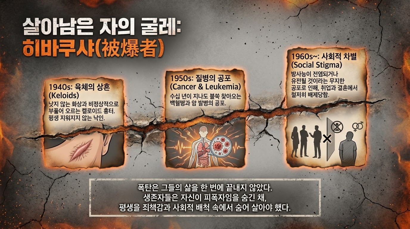 - 인도적 측면: 생존한 **피폭자(히바쿠샤)**들은 방사능 후유증뿐 아니라, "괴물을 낳을 것"이라는 사회적 낙인과 불임에 대한 공포 속에서 평생을 숨어 지내야 했습니다.