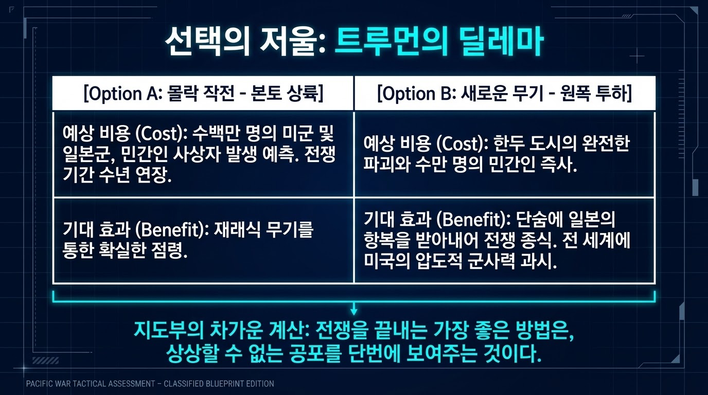 트루먼 대통령은 오키나와 전투에서 목격한 일본군의 결사 항전이 본토 상륙 작전 시 수백만 명의 미군 희생을 초래할 것이라 판단했고, 이를 막기 위한 '비용-편익 분석'의 결과로 원폭 투하를 승인했습니다.