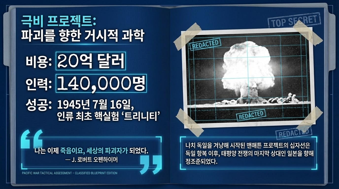 나치 독일과의 핵 패권 경쟁에서 우위를 점하기 위해 시작된 '맨해튼 프로젝트'는 당대 최고의 지성과 국가적 자본이 결집된 미증유의 군사-과학 복합체였습니다. 레슬리 그로브스 장군의 철저한 보안 관리와 로버트 오펜하이머의 천재적 리더십 아래, 미국은 불과 3년 만에 이론적 가설을 실전용 무기로 구현하는 데 성공했습니다.