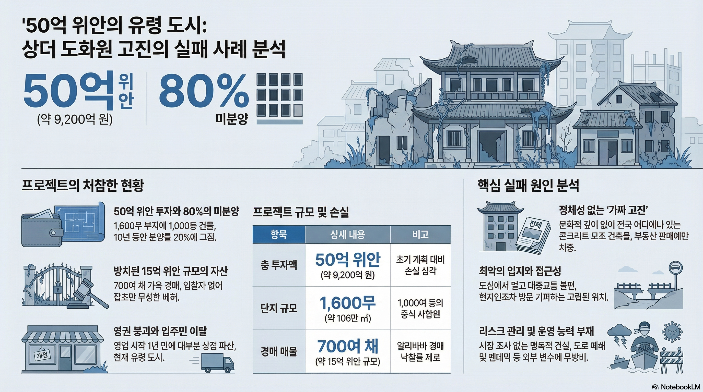 이 문서는 중국 후난성 상덕(常德 창더)시에 위치한 '도화원 고진'의 대규모 투자 실패와 황폐화 현상을 분석한 자료를 바탕으로 작성되었습니다. 50억 위안(한화 약 9,000억 원 이상)이 투입된 이 프로젝트가 왜 '유령 도시'로 전락했는지, 그리고 이와 유사한 중국 내 인공 고진 프로젝트들의 문제점을 파악하는 데 중점을 둡니다.