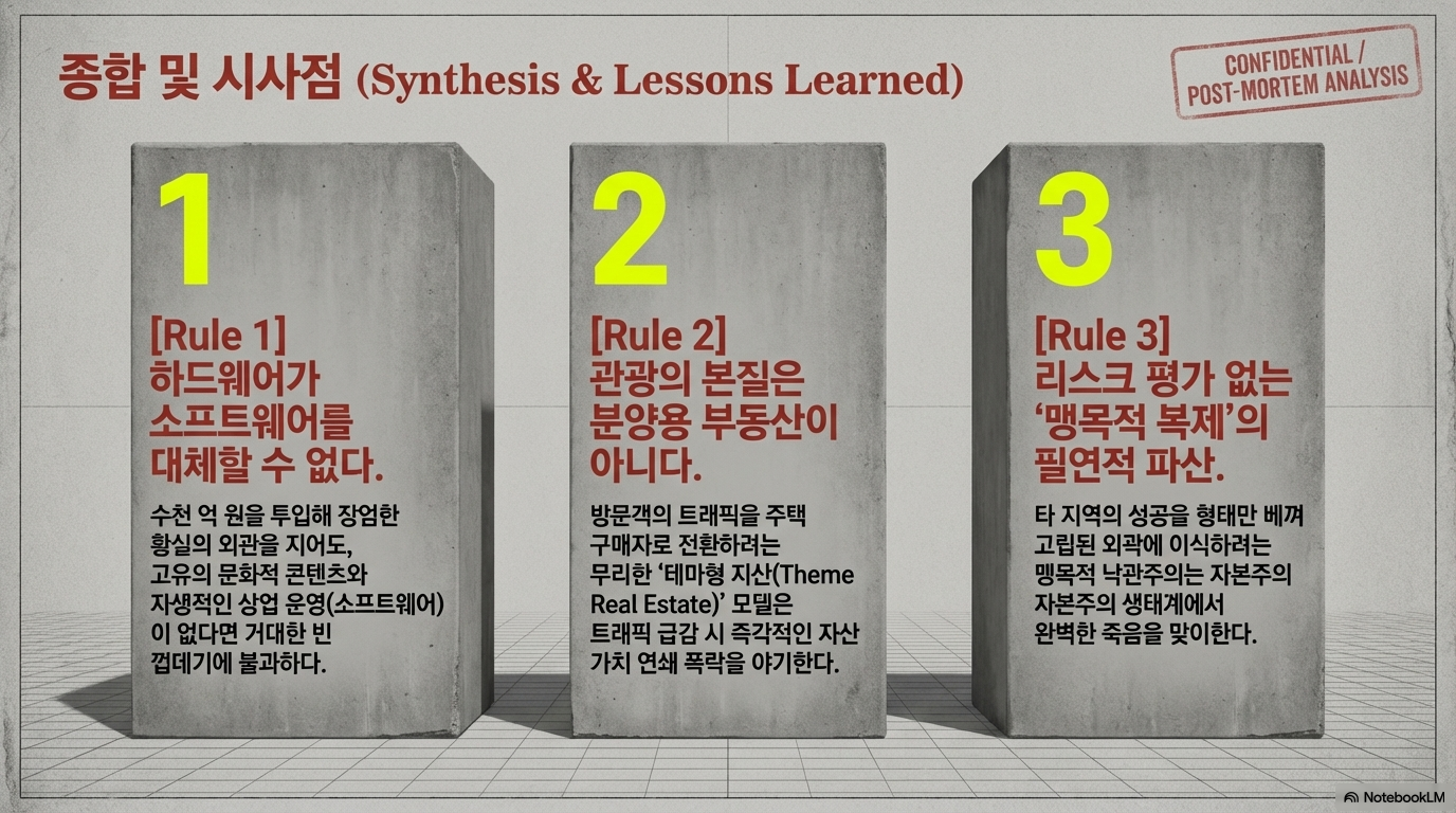 결국 미래의 개발 사업은 외형 중심의 화려함이 아닌, '지속 가능한 콘텐츠'로 방문객의 체류 이유를 증명해야 합니다. 콘텐츠가 결여된 거대 자본 투입은 그 자체로 가장 위험한 리스크임을 명심해야 합니다.