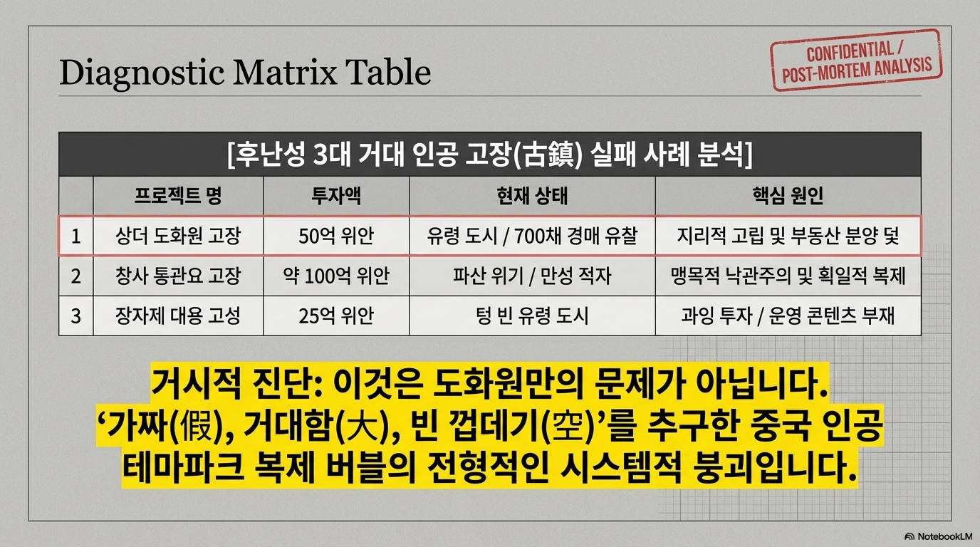 이 가이드는 막대한 자본과 국가적 인증이 투입된 프로젝트가 어째서 '유령 도시'로 전락하는지, 중국 후난성의 '도화원 고진(桃花源 古鎭)' 사례를 통해 지리적 요인과 자본의 논리, 그리고 콘텐츠 기획의 관점에서 구조적으로 분석합니다.