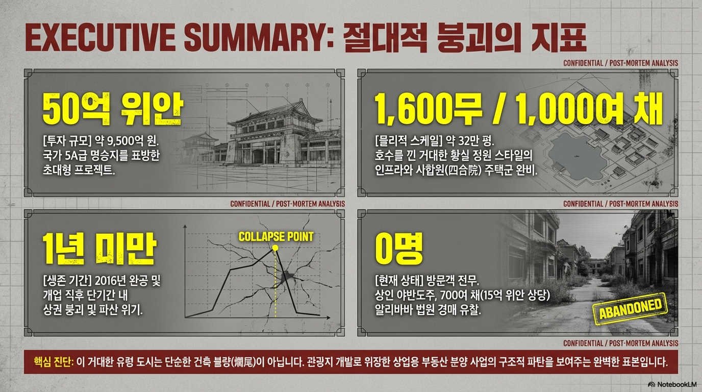 도화원 고진의 물리적 규모와 현재의 경제적 실패를 대조해 보면, 자본 투입과 시장 수요 사이의 극심한 괴리가 드러납니다.