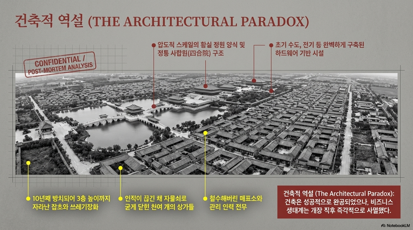 - 관광지로 위장한 부동산 개발의 한계 (Real Estate Disguise) 이 프로젝트의 실체는 관광지가 아닌 '방고 건축(모조 고건축)'의 외피를 쓴 상업용 부동산 분양 사업이었습니다. 1,000여 채의 사합원을 채당 수백만 위안에 분양하여 단기 수익을 실현하려 했으나, 분양률은 20% 미만에 그쳤습니다. 분양 실패는 곧 운영 자금의 고갈(Liquidity Trap)로 이어졌고, 이는 상권 형성을 불가능하게 만드는 결정적 원인이 되었습니다.