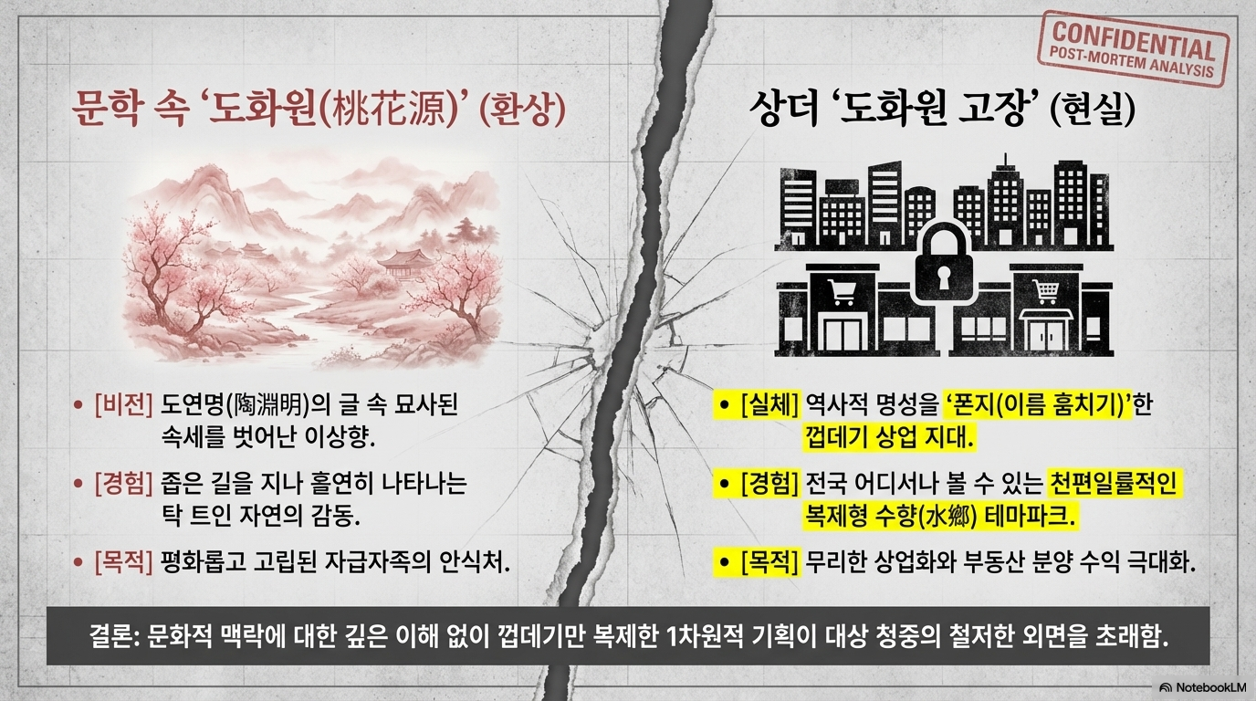 도화원 고진은 도원명의 IP를 차용했으나, 실제 구현된 콘텐츠는 진정성 없는 '복사 붙여넣기'식 건축물에 불과한 '콘텐츠의 빈곤(Poverty of Content)' 상태를 보여줍니다.